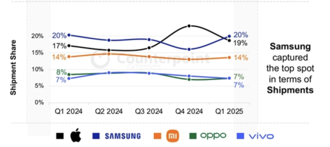 三星只以1%的微弱优势超过苹果,拿下了2025年春季的No.1。